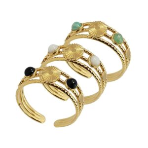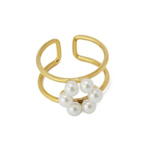 Anel com detalhe central de pérolas de vidro em forma de flor. O classicismo das pérolas combina perfeitamente com o design moderno e atual. Para usar com roupa casual ou para os seus looks de festa. Aço cirúrgico banhado a ouro. A flor mede 12 mm. Perfeito!