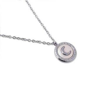 Colar de corrente fina com pingente circular de aço cirúrgico com detalhe de lua confeccionada em concha do mar 12mm. Perfeito como um charme para o dia a dia, fica ótimo sobre camisas, decotes profundos ou gola alta. Com certeza você não vai tirar, pois além de lindo, pode molhar, é leve e não causa alergias. A corrente mede 45 cm e tem 5 cm de extensão para que possa ajustar a altura ao seu gosto.