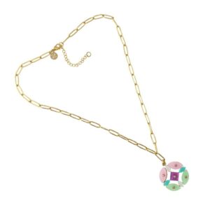 Colar mini elos com pingente tipo flor composto por peças confeccionadas em material acrílico colorido e zircônias. Cor e volume ideais para usar no dia a dia sobre camisas ou decotes gola alta. Dê um toque de cor aos seus looks e combine-o com os seus brincos a condizer. A corrente tem 45 cm de comprimento e possui fecho lagosta e mais 5 cm de extensão para ajuste de altura. Não produz alergias e pode molhar.