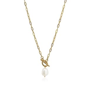 Colar composto por corrente de elos e detalhe central, que funciona ao mesmo tempo como fecho de alavanca, com pérola de água doce. 2022 é o ano das pérolas, com designs reinventados como este, que se destaca pela originalidade e estilo. É feito de aço cirúrgico banhado a ouro, não produz alergias e é inox. Mede 40 cm de comprimento.